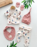 Ensemble 5 pièces pour nouveau-né en tissu côtelé imprimé à motifs éléphants et géométriques 2avec liens latéraux